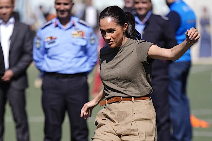 The Duchess of Sussex takes a penalty shot during a visit to the QuestScope Youth Center at the Za’atari refugee camp, home to displaced Syrians, near Mafraq in northern Jordan on February 25, 2026.
